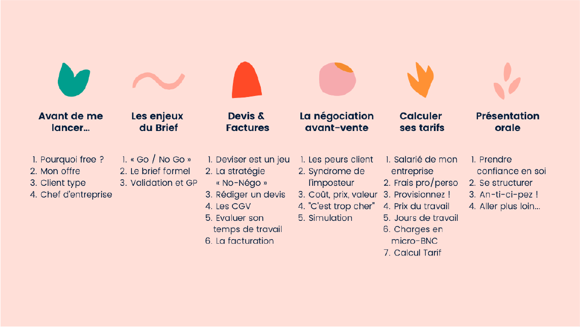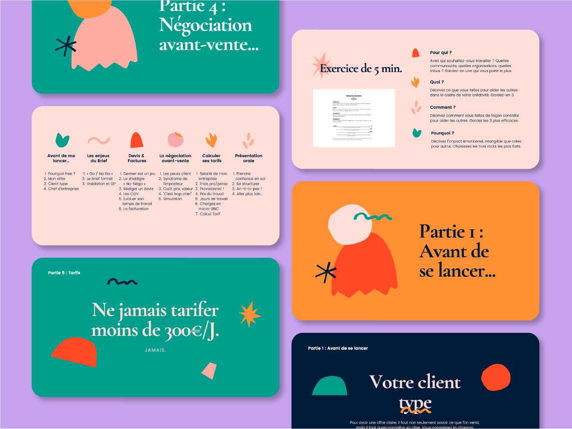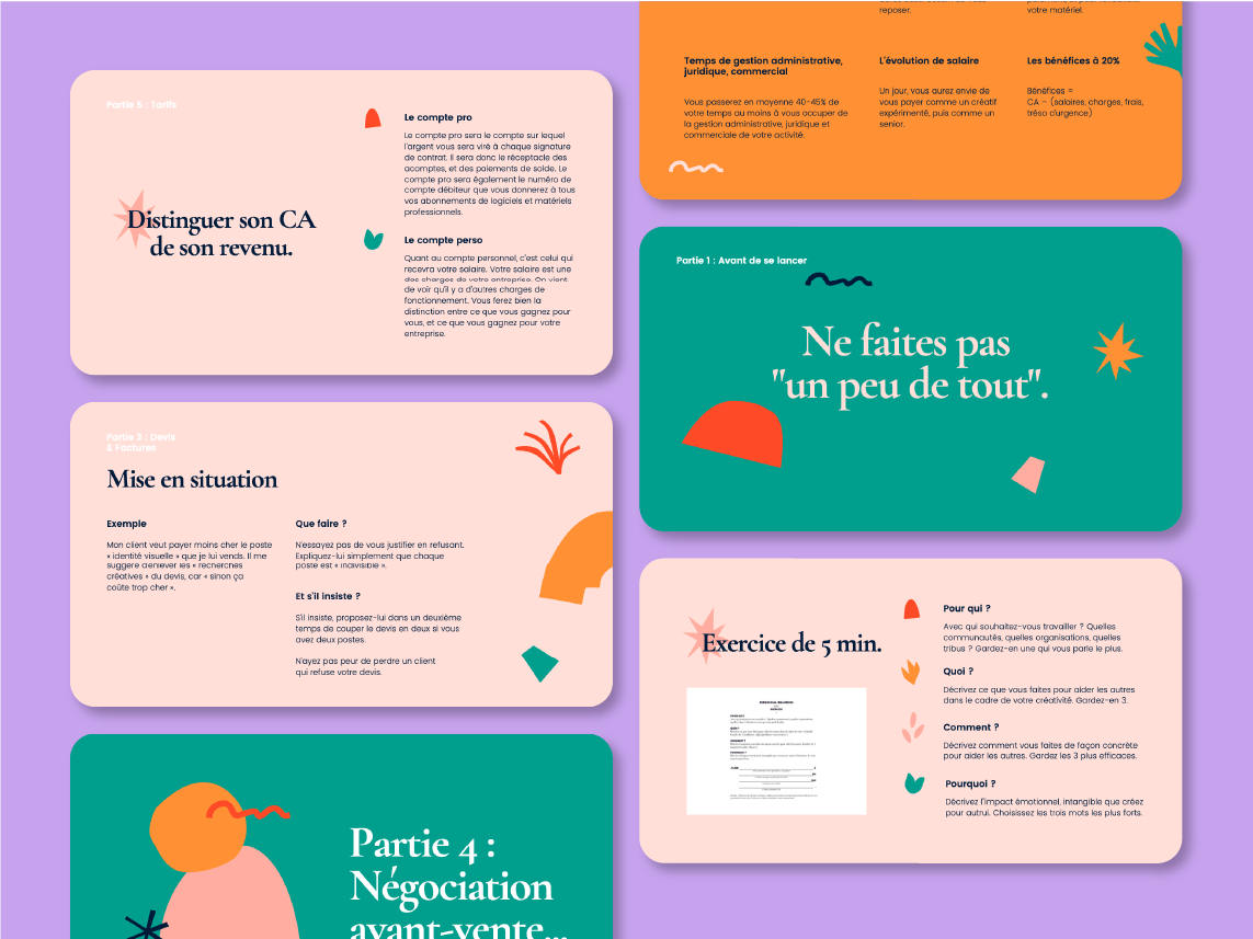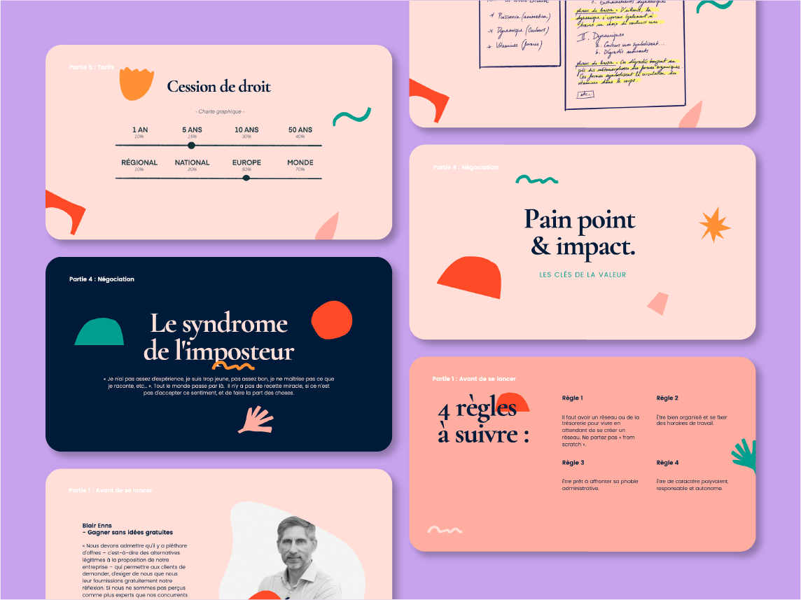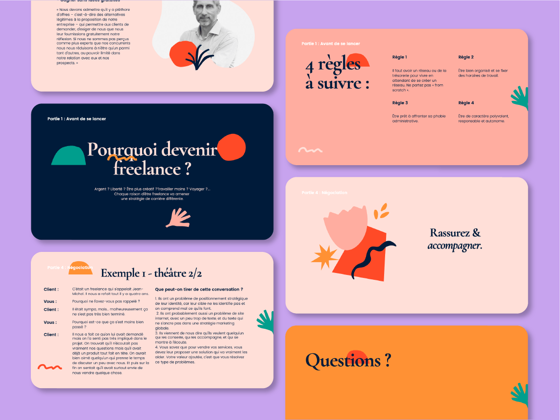 J'ai conçu, rédigé et créé des cours de "freelancing" que je délivre à l'école des Gobelins dans la section "Graphisme Motion Design". Il s'agit d'un enseignement entrepreneurial que je donne depuis l'année 2019.